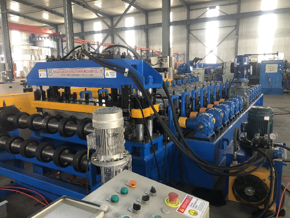 中拓#彩钢琉璃瓦机 的优越性能还体现在其快捷稳定的运行保障上。设备配备的油冷机堪称 “降温器”,它通过细密的热交换系统,持续为液压油调节温度,即使设备满负荷 24 小时不间断运转,也能让液压油始终保持在好的工作温度,如同为设备披上了一层 “恒温铠甲”,有效延长设备使用寿命,降低维护成本。自动输送码垛开合与气动摆臂的配合更是精妙绝伦,它们如同训练有素的 “机械战队”,默契协作,快速、准确地将成型的琉璃瓦推齐码垛,相比传统人工操作,生产效率实现了质的飞跃。